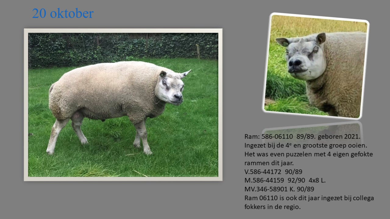 Doordat ram 06110 vorig herfst eerst niet bevruchte vanwege B.T. is ram: 586-98939. V.6618-64036 89/89 M.586-44177 92/92 ingezet met een tevreden resultaat, luxe complete lammeren. Meeste lammeren zijn eind maart geboren en zullen nog verder uit en door moeten groeien tot het gewenste resultaat.